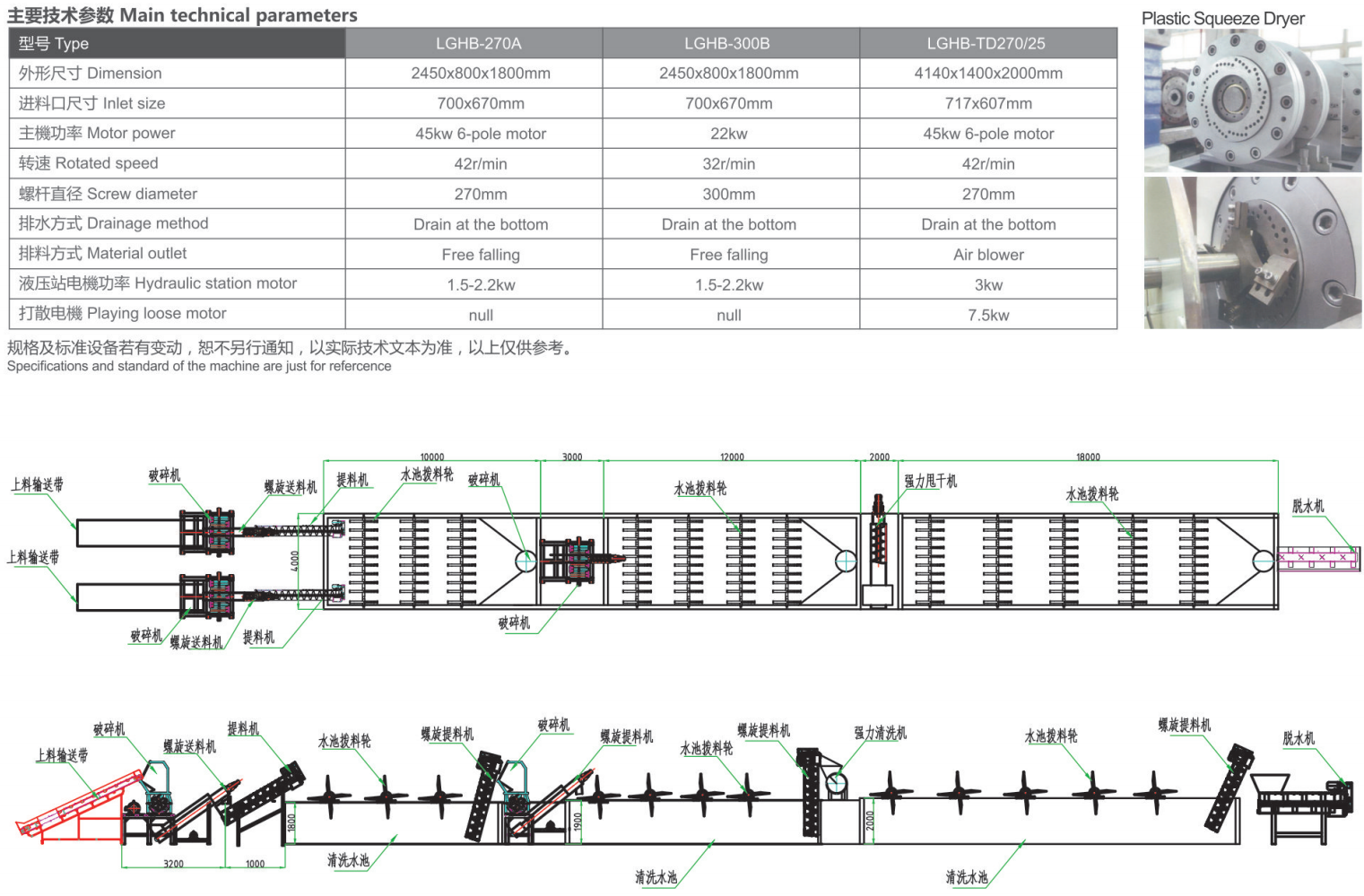 本機(jī)采用獨特的設(shè)計,使從水槽中清洗出來的薄膜經(jīng)過上料機(jī)可直接擠擰設(shè)備中進(jìn)行強(qiáng)制脫水,再經(jīng)過后面的干燥機(jī)構(gòu)進(jìn)行干燥,使含水量降到最低程度,達(dá)到含水量5%左右,為后面的造粒提供最佳物料,減少了原來常用的大功率脫水機(jī)結(jié)構(gòu),此